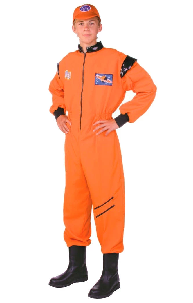 Costume Includes Long Sleeve Orange Jumpsuit with Black Collar, Cuffs and Capped Shoulders with Patches on Chest and Matching Cap.  Poplin material.Â