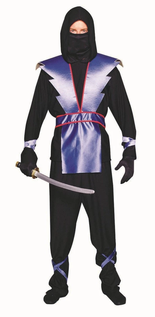 Teen Costume Includes Black Long Sleeve Hooded Top with Blue Foamed Armor, Black Pants and Face Scarf. Sword and Gloves Not Included.