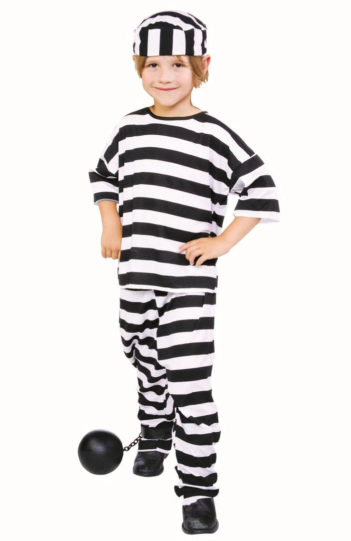 Convict Boy Costume Includes Short Sleeve Black and White Stripe Shirt, Matching Striped Hat and Pants. Ball and chain not included.