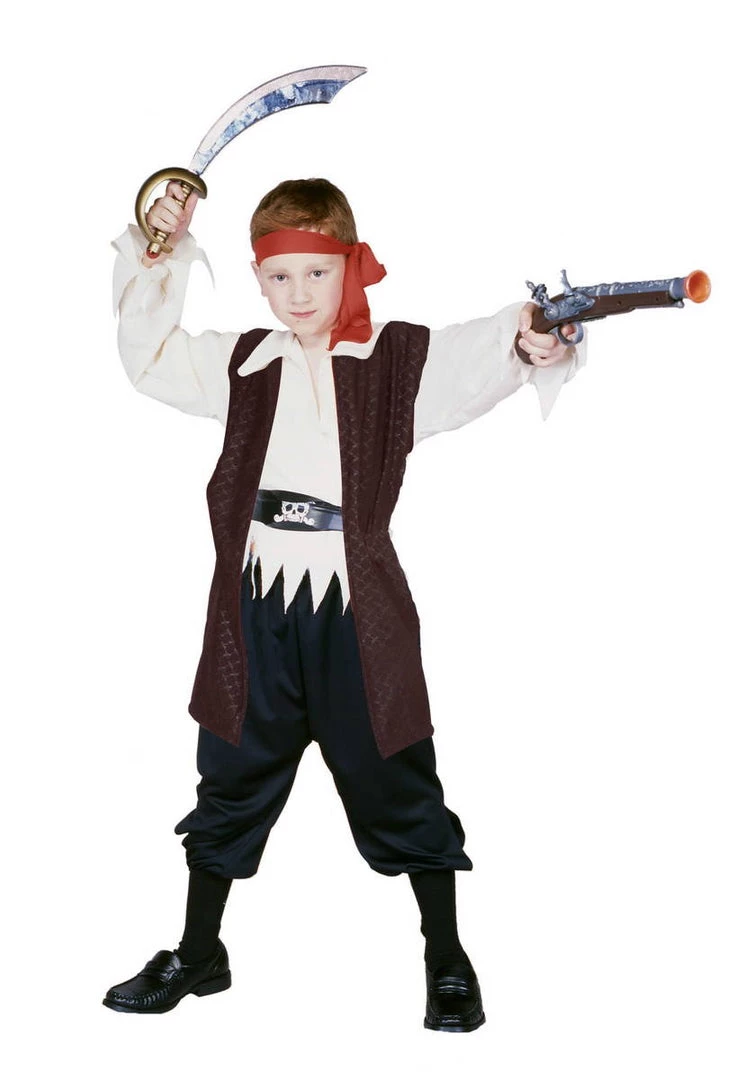 Children’s Costume Includes Headband, Long Sleeve Shirt with Zig Zag Cut edges, Long Vest, Vinyl Belt with Skull & Crossbones and Pants.