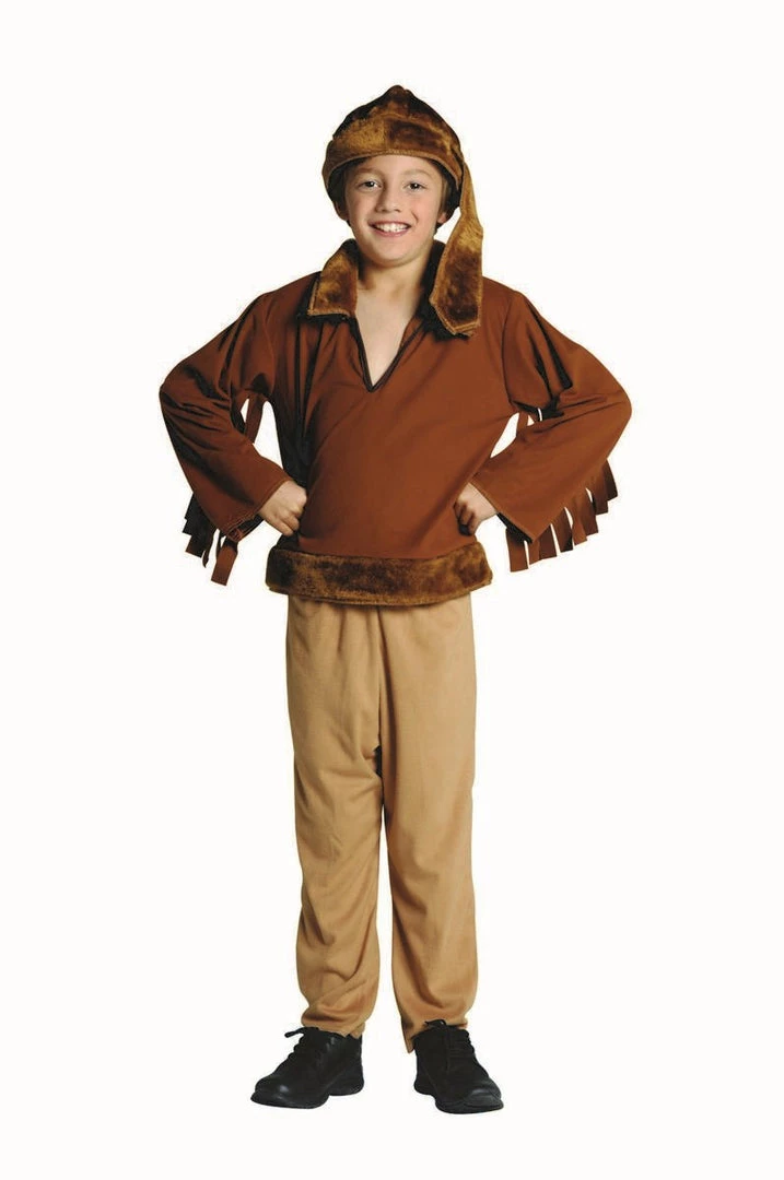 Long Sleeved Dark Brown Shirt with Fringe and Faux Fur Around Cuffs and Bottom, Light Brown Pants and Dark Brown Faux Fur Cap.