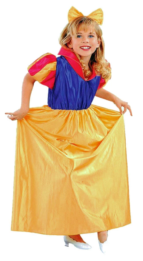 Girls Snow Whtie Costume Includes Full Length Dress with Blue Top, Red and Yellow Striped Short Sleeves, Red Collar, Attached Yellow Skirt and Bow Headpiece.