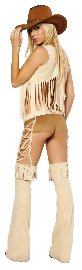 Sexy Cowboy / Cowgirl 5 Piece Western Costume Includes Hat, Halter Top, Vest with Fringe, Shorts, Chaps with Fringe and Antique Brass Belt. Color: Tan/Brown. Fabric: Poly.