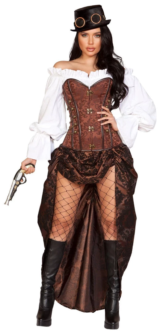Includes Long Sleeves Top, Corset with Lace-Up and Hook Closure, High Cut Skirt, Toy Gun, Top Hat, & Goggles. Hose sold separately.Â