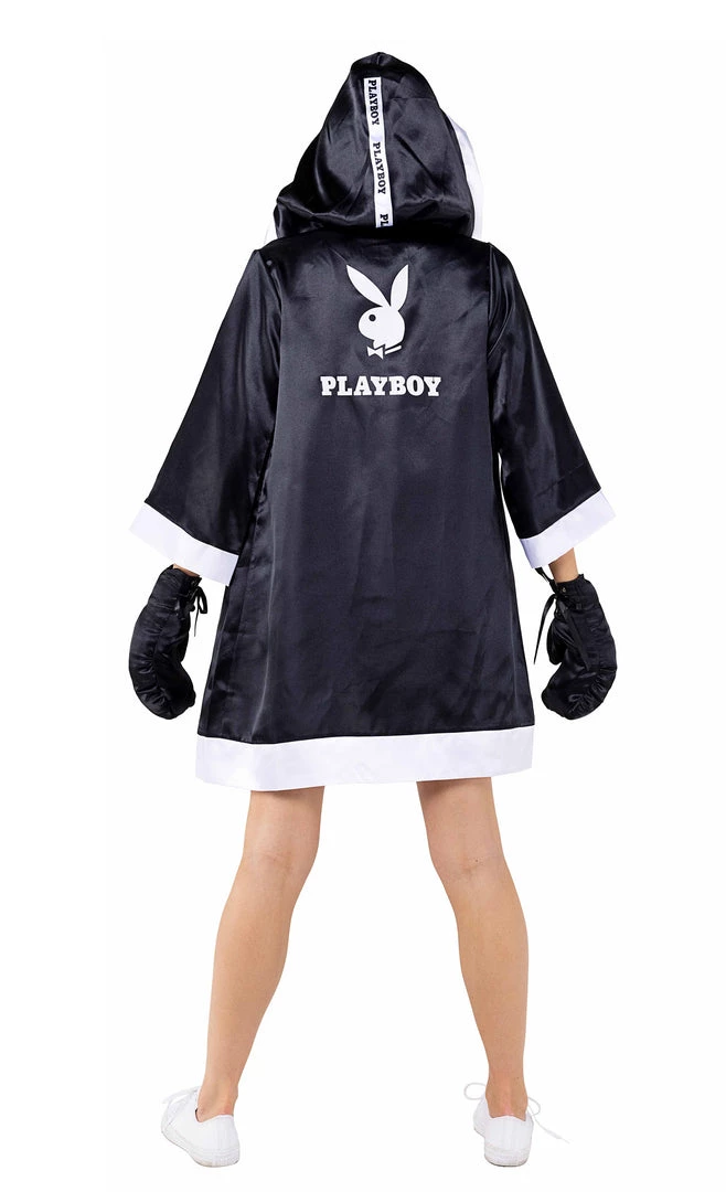 Includes Bralette with Playboy Elastic, Satin Shorts, Playboy Champion Belt, Pair of Satin Gloves, & Hooded Robe with Playboy Print