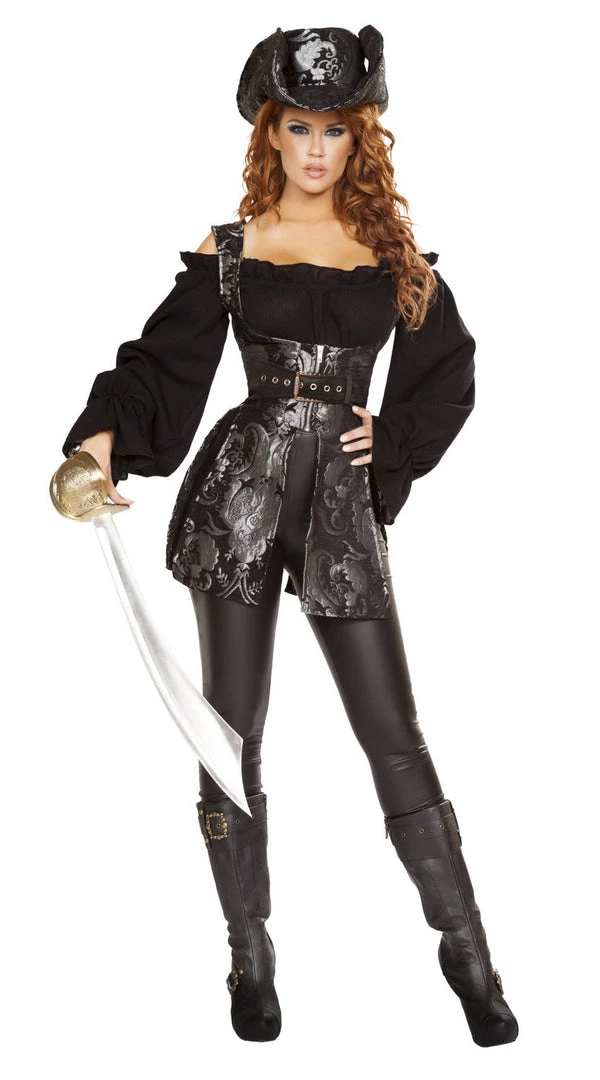 Brocade Waist Cincher with Lace-up Back, Zipper Front and Belt Detail. Ruffled off Shoulder Blouse, and Pants. Hat not included.Â
